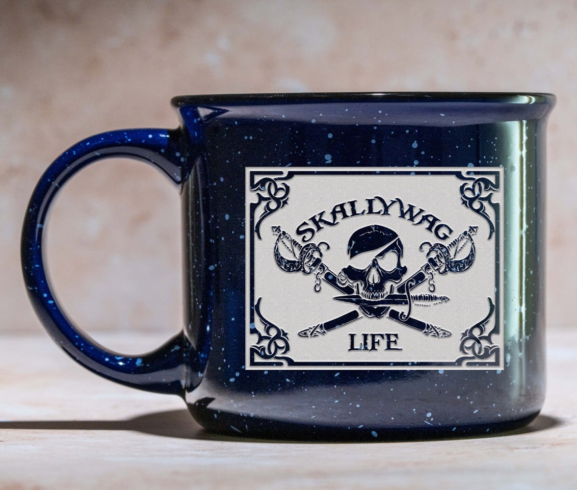 Made in the style of tin cups, they come in rich navy blue color and feature a unique speckled finish that will get your attention. They also have a slightly flared top for easier drinking and fewer spills. These custom campfire mugs also have a c-shaped handle for an easy grip. The deep carved effects of the sand carvings Skallywag Life logo stands out against the speckled backdrop.